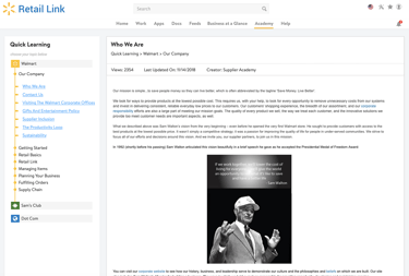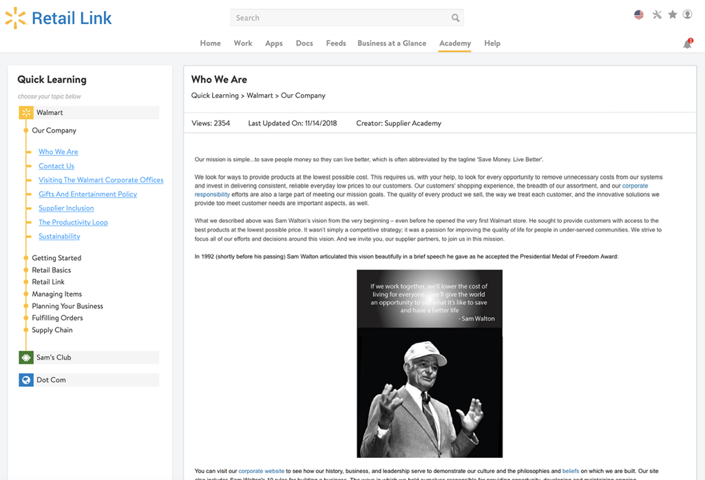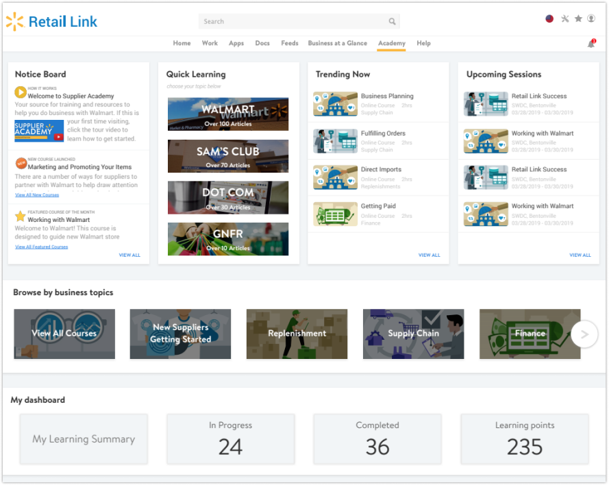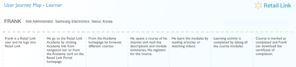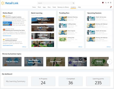 Retail Link® is an online hub for the data, documentation, reports, and special applications that suppliers use to manage their business with Walmart. Nearly 250k users from different supplier companies use Retail Link to manage their day-to-day business with Walmart. The Retail Link application is so vast and complex that users need to have a steep learning curve to use various features of the application. Various third-party companies train the users on how to use the Retail Link application. Walmart also has lots of training material that is not easily accessible to users. To resolve this issue, a separate Learning Management System to provide training to the Retail Link users.