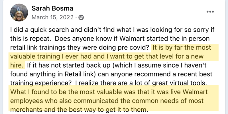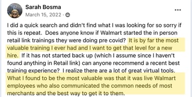 Fully delivered by Walmart Supplier Training team which covers in and out of many business topics necessary for a Walmart Supplier